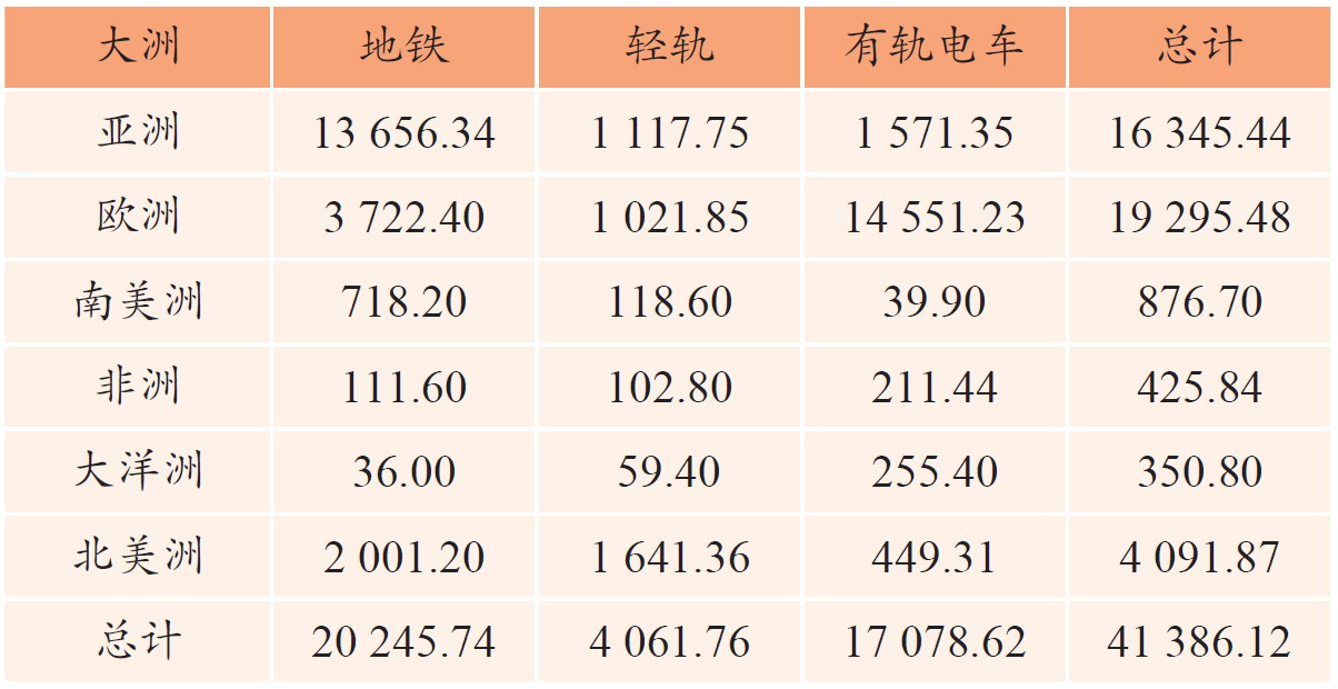 ప్రపంచంలోని ప్రధాన ఖండాలలో పట్టణ రైలు రవాణా యొక్క మొత్తం స్థాయిని మూర్తి 1 చూపిస్తుంది (గమనిక: రష్యాలోని అన్ని నగరాలు గణన కోసం యూరప్గా వర్గీకరించబడ్డాయి). సబ్వేలు మరియు ట్రామ్లు ప్రపంచవ్యాప్తంగా పట్టణ రైలు రవాణా యొక్క ప్రధాన స్రవంతి రకాలు అని డేటా సూచిస్తుంది మరియు గ్లోబల్ అర్బన్ రైలు రవాణా ప్రధానంగా యురేషియాలో కేంద్రీకృతమై ఉంది, సబ్వేలు ప్రధానంగా ఆసియా దేశాలలో పంపిణీ చేయబడ్డాయి.[1]
