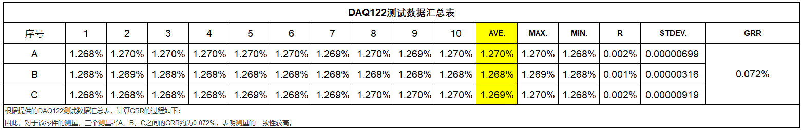 ఎంచుకున్న డేటా సేకరణ కార్డ్ అవసరాలకు అనుగుణంగా ఉందని నిర్ధారించుకోవడానికి, ME బృందం దీనిని పరీక్షించింది. ఎంచుకున్న డేటా సేకరణ కార్డ్ అద్భుతమైన స్థిరత్వాన్ని కలిగి ఉందని విశ్లేషణ చూపిస్తుంది, A, B మరియు C అనే మూడు కొలతలలో GRR సుమారు 0.072%.