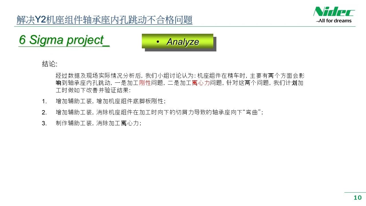 DMAIC మెరుగుదల ప్రక్రియ ఐదు దశలను కలిగి ఉంటుంది: నిర్వచించండి, కొలవండి, విశ్లేషించండి, మెరుగుపరచండి మరియు నియంత్రించండి. ఈ ఐదు దశలు పూర్తి-ప్రాసెస్ నాణ్యత మెరుగుదల పద్ధతిని కలిగి ఉంటాయి మరియు ప్రతి దశ అనేక పని దశలను కలిగి ఉంటుంది. డబుల్-సపోర్టెడ్ మెషిన్ బేస్ మరియు బేరింగ్ ఛాంబర్ అసెంబ్లీ యొక్క అసెంబ్లీ తర్వాత ముందు మరియు వెనుక బేరింగ్ ఛాంబర్ల కోక్సియాలిటీ మరియు అసెంబ్లీ ముగింపు ముఖం యొక్క రనౌట్ అస్థిరంగా ఉండే సమస్య యొక్క మెరుగుదల యొక్క సంక్షిప్త వివరణ క్రిందిది:
