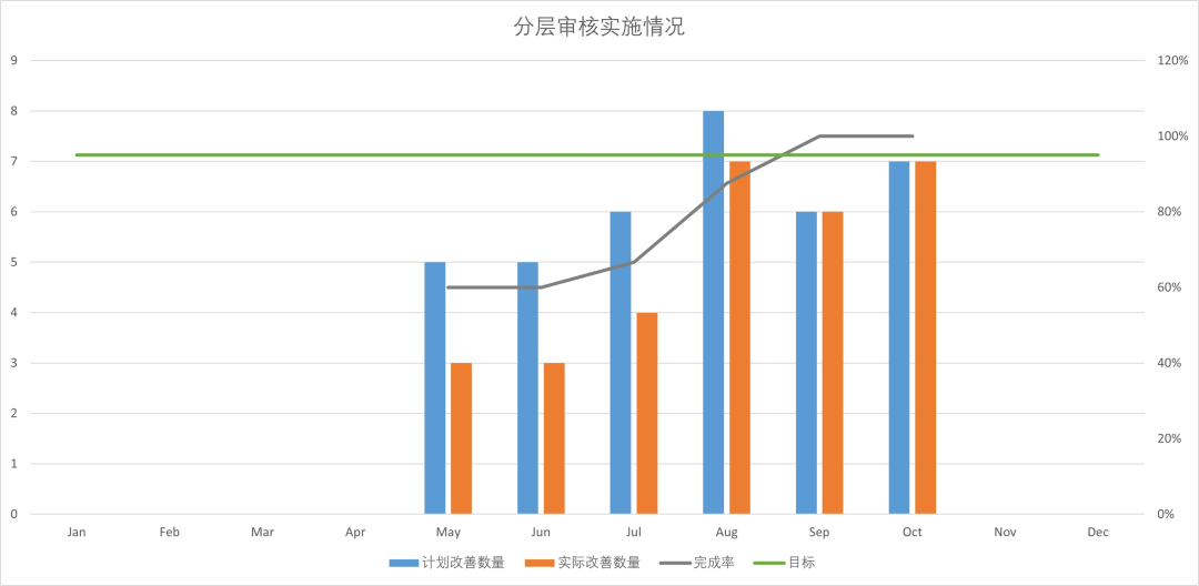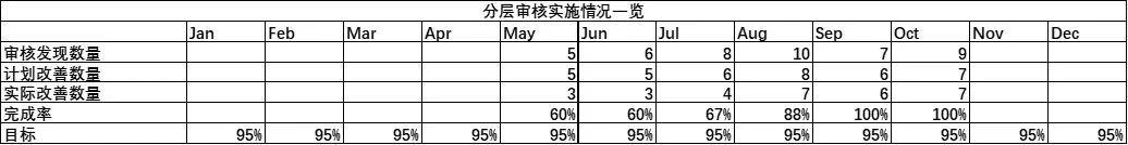 లేయర్డ్ ప్రాసెస్ ఆడిట్ల యొక్క కంటెంట్ విస్తృతంగా ఉంది. ఆడిట్ల సామర్థ్యం మరియు నాణ్యతను పర్యవేక్షించడానికి, LPA యొక్క వాస్తవ అమలు డాష్బోర్డ్ మాదిరిగానే ప్రదర్శించబడుతుంది. ప్రదర్శించబడిన కంటెంట్లో ఇవి ఉన్నాయి: అమలు యొక్క పూర్తి రేటు, ఆడిట్ ఫలితాల సంఖ్య, మెరుగుదలల పూర్తి రేటు మొదలైనవి.