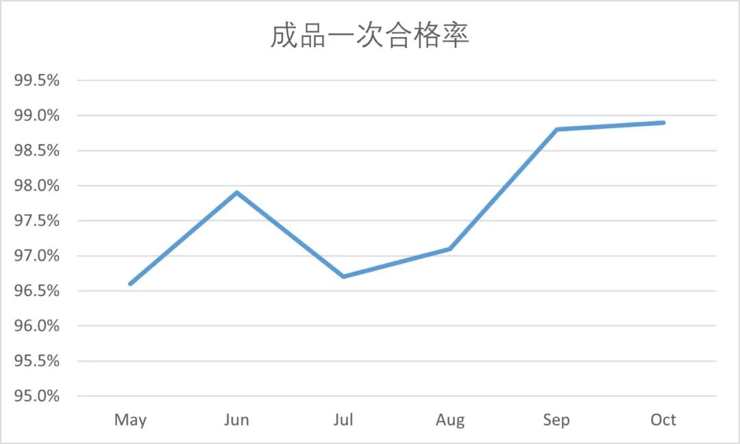 ఈ నాణ్యత నెల మెరుగుదల చొరవ అమలు ద్వారా, అన్ని ఉద్యోగుల నాణ్యత అవగాహన గణనీయంగా మెరుగుపరచబడింది మరియు నాణ్యత సూచికలు బాగా మెరుగుపడ్డాయి. ప్రత్యేకంగా, 5M1E లోని "మనిషి" కారకానికి సంబంధించిన లోపాలు గణనీయంగా తగ్గాయి; తప్పిపోయిన సంస్థాపన, తప్పు సంస్థాపన మరియు మిశ్రమ సంస్థాపన రేట్లు ముఖ్యంగా తగ్గాయి; సంబంధిత ప్రక్రియలలో సంభావ్య నాణ్యత ప్రమాదాలు బాగా తగ్గించబడ్డాయి; మరియు ప్రక్రియల యొక్క కార్యాచరణ నాణ్యత నిరంతరం ఆప్టిమైజ్ చేయబడింది. తత్ఫలితంగా, ఫస్ట్-పాస్ దిగుబడి మరియు తుది ఉత్పత్తి ఫస్ట్-పాస్ అర్హత రేటు 1-2%పెరిగింది, కస్టమర్ ఫిర్యాదులు మరియు ఉత్పత్తి రాబడి గణనీయంగా తగ్గింది. డేటాలో ఈ స్పష్టమైన మెరుగుదలలు మెరుగుదల చొరవ యొక్క ప్రభావాన్ని మరియు విలువను పూర్తిగా ప్రదర్శిస్తాయి.